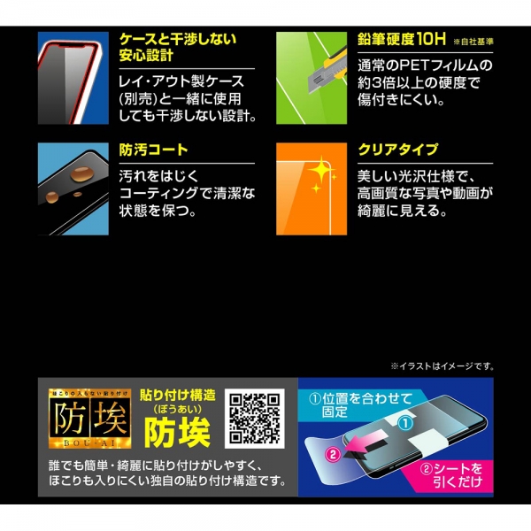 画面が綺麗に見えるクリアタイプ。通常のPETフィルムの約3倍以上の硬度で傷付きにくい。誰でも簡単・綺麗に貼り付けがしやすく、ほこりも入りにくい独自の貼り付け構造です。美しい光沢仕様で、高画質な写真や動画が綺麗に見える。貼り付け時に入ってしまう小さな気泡が消えやすい特殊なシリコン膜。