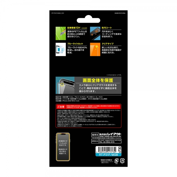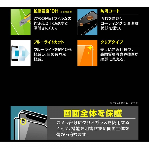 目の疲れを軽減/クリアタイプ。カメラ部分にクリアガラスを使用することで、機能を阻害せずに画面全体を傷から守ります。通常のPETフィルムの約3倍以上の硬度で傷付きにくい。ブルーライトを約40%軽減し、目の疲れを軽減。美しい光沢仕様で、高画質な写真や動画が綺麗に見える。