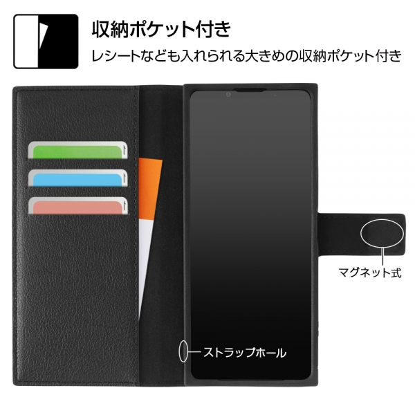 キャラクターのラインアートを型押しでシンプルに表現。四つ角のエアクッション+柔軟なTPU素材で極めて高い耐衝撃性を実現。お好きなカードが入れられるICカードポケット&収納ポケット付き。マグネット式なのでケースの開閉が簡単に行える。スタンドとして使用でき、快適な動画視聴が可能。
