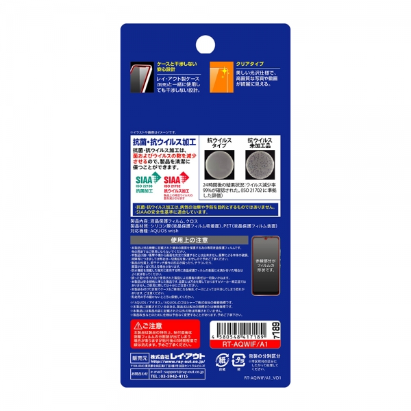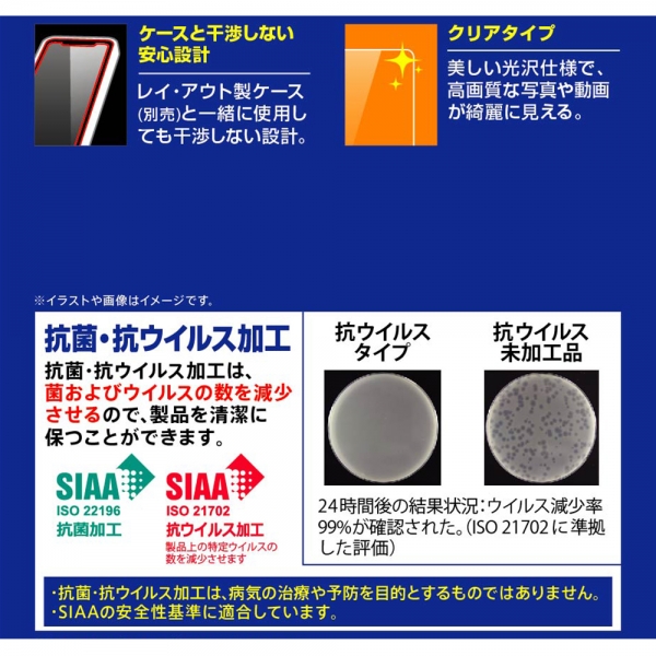 画面が綺麗に見えるクリアタイプ。レイ・アウト製ケース(別売)と一緒に使用しても干渉しない設計。美しい光沢仕様で、高画質な写真や動画が綺麗に見える。ウイルスの数を減少させ、製品を清潔に保つことができます。SIAAの安全性基準に適合。貼り付け時に入ってしまう小さな気泡が消えやすい特殊なシリコン膜。