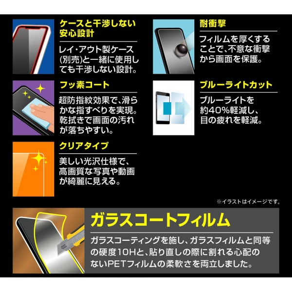 目の疲れを軽減/クリアタイプ。ガラスコーティングを施し、ガラスフィルムと同等の硬度10Hと、貼り直しの際に割れる心配のないPETフィルムの柔軟さを両立。ブルーライトを約40%軽減し、目の疲れを軽減。超防指紋効果で、滑らかな指すべりを実現。乾拭きで画面の汚れが落ちやすい。美しい光沢仕様で、高画質な写真や動画が綺麗に見える。