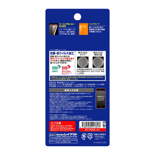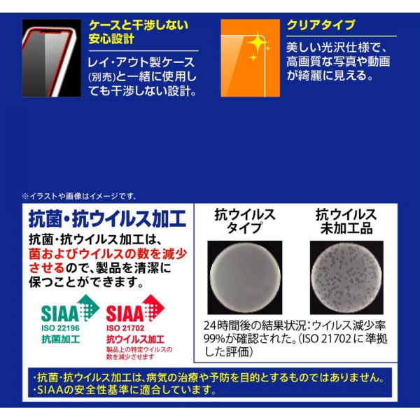 画面が綺麗に見える。レイ・アウト製ケース(別売)と一緒に使用しても干渉しない設計。美しい光沢仕様で、高画質な写真や動画が綺麗に見える。ウイルスの数を減少させ、製品を清潔に保つことができます。SIAAの安全性基準に適合。貼り付け時に入ってしまう小さな気泡が消えやすい特殊なシリコン膜。